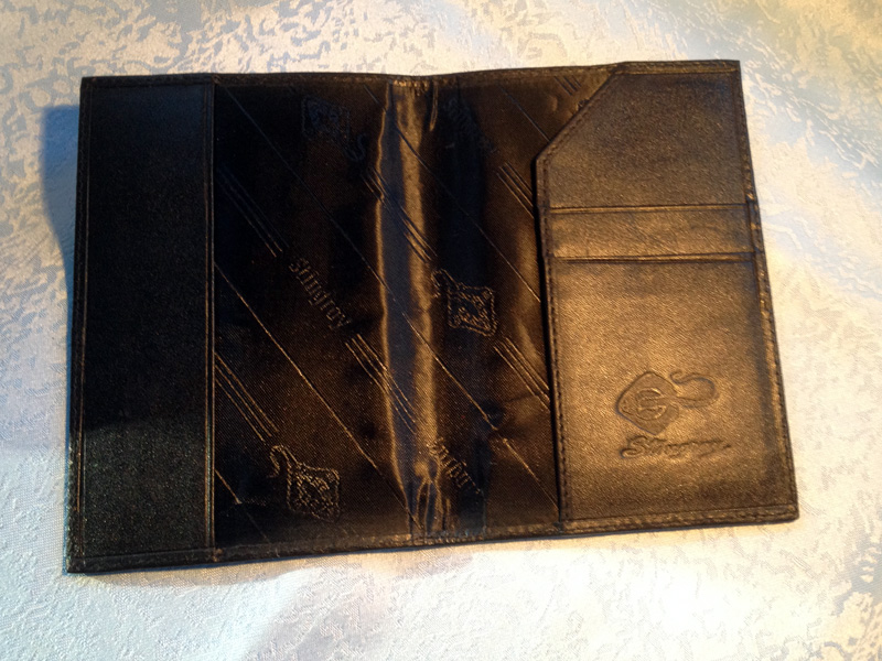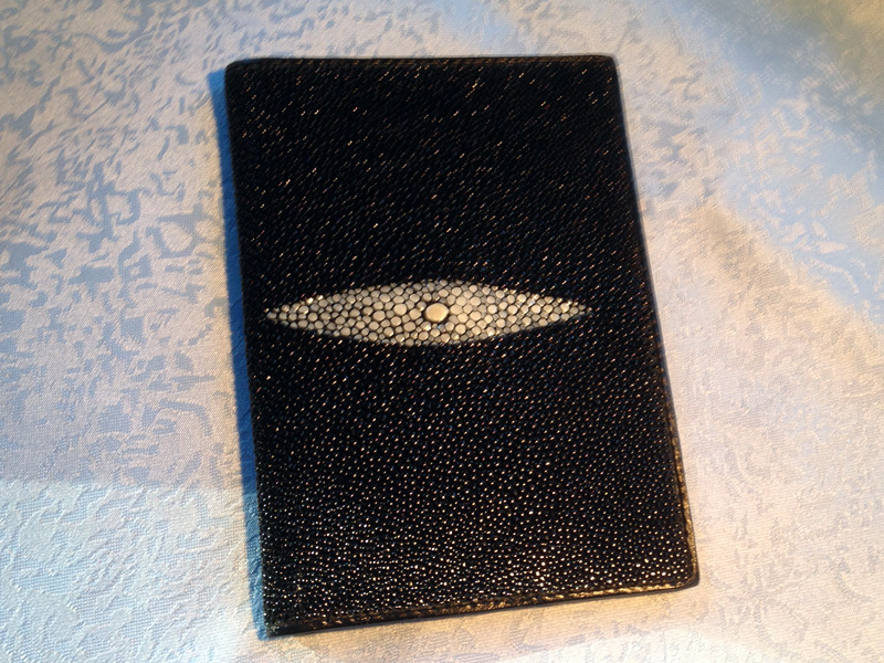 Passetui aus Rochenleder mit Einlagelaschen in verschiedenen Farben. Innenseite mit Stoff gepolstert.